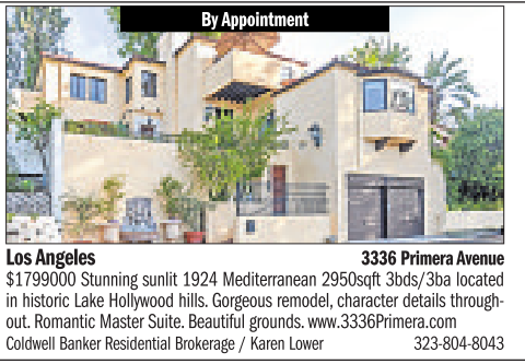 By Appointment Los Angeles 3336 PrimeraAvenue $1799000 Stunning sunlit 1924 Mediterranean 2950sqft 3bds/3ba located in historic Lake Hollywood hills.Gorgeous remodel,characterdetails throughout. Romantic Master Suite. Beautiful grounds. www.3336Primera.com Coldwell Banker Residential Brokerage /Karen Lower 323-804-8043