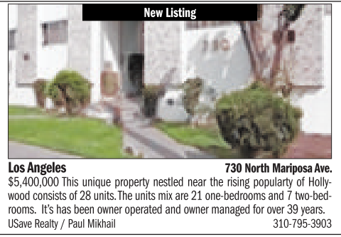 NewListing Los Angeles 730North Mariposa Ave. $5,400,000 This unique property nestled near the rising popularty of Hollywoodconsists of 28 units.The units mix are 21 one-bedroomsand 7two-bedrooms. It’shas been owner operated and ownermanaged for over 39 years. USave Realty /PaulMikhail 310-795-3903
