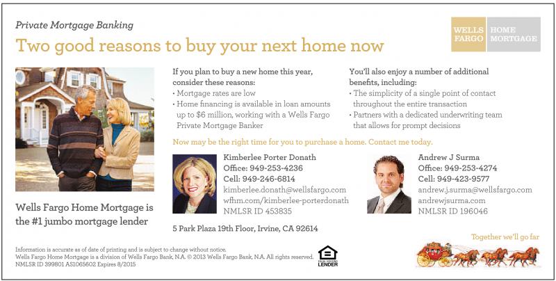 Private Mortgage Banking Two good reasons to buy your next home now If you plan to buy a new home this year, consider these reasons: • Mortgage rates are low • Home financing is available in loan amounts up to $6 million, working with a Wells Fargo Private Mortgage Banker You’ll also enjoy a number of additional benefits, including: • The simplicity of a single point of contact throughout the entire transaction • Partners with a dedicated underwriting team that allows for prompt decisions Now may be the right time for you to purchase a home. Contact me today. Wells Fargo Home Mortgage is the #1 jumbo mortgage lender Kimberlee Porter Donath Office: 949-253-4236 Cell: 949-246-6814 kimberlee.donath@wellsfargo.com wfhm.com/kimberlee-porterdonath NMLSR ID 453835 5 Park Plaza 19th Floor, Irvine, CA 92614 Andrew J Surma Office: 949-253-4274 Cell: 949-423-9577 andrew.j.surma@wellsfargo.com andrewjsurma.com NMLSR ID 196046 Information is accurate as of date of printing and is subject to change without notice. Wells Fargo Home Mortgage is adivision of Wells Fargo Bank, N.A. ©2013 WellsFargo Bank, N.A. All rights reserved. NMLSR ID 399801 AS1065602 Expires 8/2015
