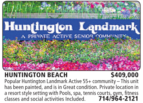 HUNTINGTON BEACH $409,000 PopularHuntingtonLandmarkActive55+ community –Thisunit has beenpainted,and is in Greatcondition.Privatelocationin aresortstyle setting with Pools,spa,tennis courts, gym, fitness classesand social activitiesIncluded. 714/964-2121