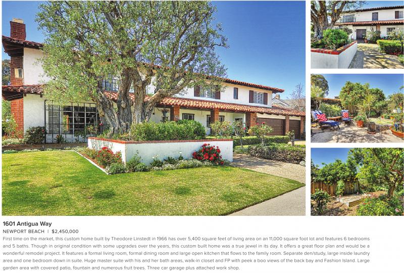 1601 Antigua Way NEWPORT BEACH | $2,450,000 First time on the market, this custom home built by Theodore Linstedt in 1966 has over 5,400 square feet of living area on an 11,000 square foot lot and features 6 bedrooms and 5 baths. Though in original condition with some upgrades over the years, this custom built home was a true jewel in its day. It offers a great floor plan and would be a wonderful remodel project. It features a formal living room, formal dining room and large open kitchen that flows to the family room. Separate den/study, large inside laundry area and one bedroom down in suite. Huge master suite with his and her bath areas, walk-in closet and FP with peek a boo views of the back bay and Fashion Island. Large garden area with covered patio, fountain and numerous fruit trees. Three car garage plus attached work shop.