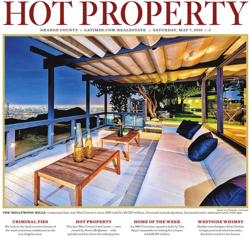 Marc and Tiffany Angeles THE HOLLYWOOD HILLS compound that was Wes Craven’s since 1992 sold for $3.525 million. Grounds include gardens, koi ponds and a saltwater pool with spa.