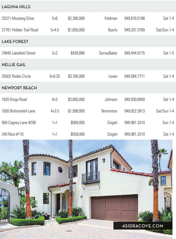 GUNA HILLS 25371 Mustang Drive 5+6 $2,390,000 Feldman 949.678.5198 Sat 1-4 27761 Hidden TrailRoad 5+4.5 $1,650,000 Byerly 949.207.3789 Sat/Sun 1-4 KE FOREST 24845 Lakefield Street 3+2 $439,888 SerraoBaker 949.444.9175 Sat 1-5 NELLIE GAIL 25502Rodeo Circle 6+6.25 $3,785,000 Levan 949.584.7771 Sat 1-4 NEWPORTBEACH 1620 KingsRoad 6+5 $3,695,000 Johnson 949.939.8000 Sat 1-4 1826 Buttonshell Lane 4+3.5 $1,999,000 Norminton 949.922.3813 Sat/Sun 1-4 950 Cagney Lane #208 1+1 $569,000 Szigeti 949.981.3310 Sun 1-4 240 Nice #116 1+1 $559,000 Szigeti 949.981.3310 Sat 1-4 4SIDRACOVE.COM