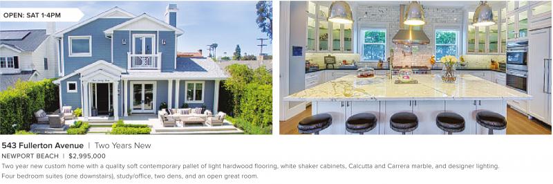 543 Fullerton Avenue | Two Years New NEWPORT BEACH | $2,995,000 Two year new custom home with a quality soft contemporary pallet of light hardwood flooring, white shaker cabinets, Calcutta and Carrera marble, and designer lighting. Four bedroom suites (one downstairs), study/office, two dens, and an open great room.