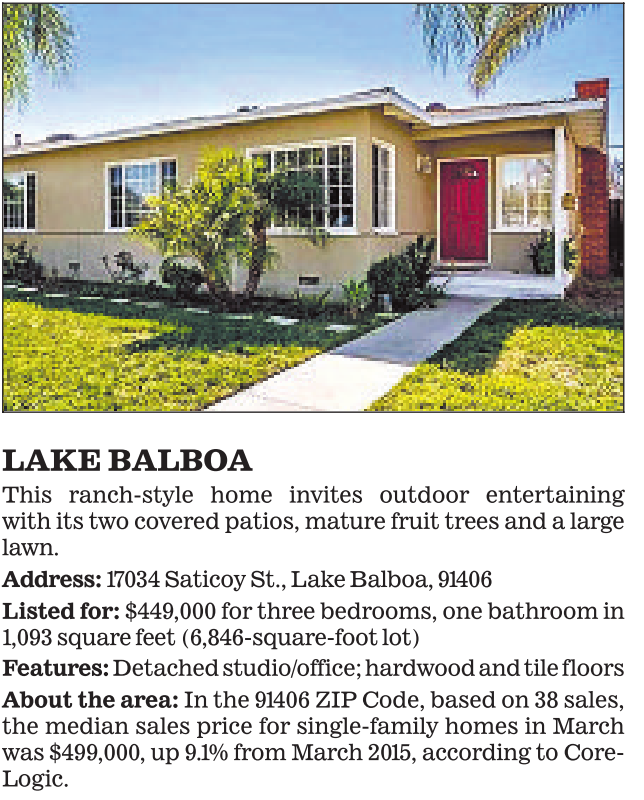 LAKE BALBOA This ranch-style home invites outdoor entertaining with its two covered patios, mature fruit trees and a large lawn. Address: 17034 Saticoy St., Lake Balboa, 91406 Listed for: $449,000 for three bedrooms, one bathroom in 1,093 square feet (6,846-square-foot lot) Features: Detached studio/office; hardwood and tile floors About the area: In the 91406 ZIP Code, based on 38 sales, the median sales price for single-family homes in March was $499,000, up 9.1% from March 2015, according to Core- Logic.