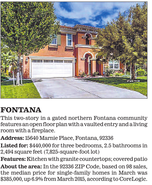 FONTANA This two-story in a gated northern Fontana community features an open floor plan with a vaulted entry and a living room with a fireplace. Address: 15640 Marnie Place, Fontana, 92336 Listed for: $440,000 for three bedrooms, 2.5 bathrooms in 2,494 square feet (7,825-square-foot lot)