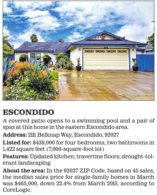 ESCONDIDO A covered patio opens to a swimming pool and a pair of spas at this home in the eastern Escondido area. Address: 2111 Belknap Way, Escondido, 92027 Listed for: $439,000 for four bedrooms, two bathrooms in 1,422 square feet (7,000-square-foot lot) Features: Updated kitchen; travertine floors; drought-tolerant landscaping About the area: In the 92027 ZIP Code, based on 45 sales, the median sales price for single-family homes in March was $465,000, down 22.4% from March 2015, according to CoreLogic.