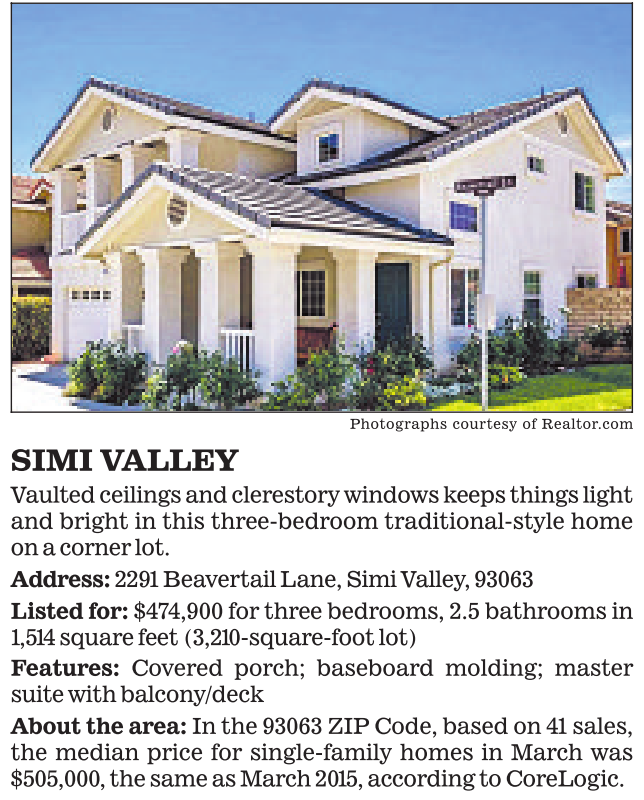 Photographs courtesy of Realtor.com SIMI VALLEY Vaulted ceilings and clerestory windows keeps things light and bright in this three-bedroom traditional-style home on a corner lot. Address: 2291 Beavertail Lane, Simi Valley, 93063 Listed for: $474,900 for three bedrooms, 2.5 bathrooms in 1,514 square feet (3,210-square-foot lot) Features: Covered porch; baseboard molding; master suite with balcony/deck About the area: In the 93063 ZIP Code, based on 41 sales, the median price for single-family homes in March was $505,000, the same as March 2015, according to CoreLogic.
