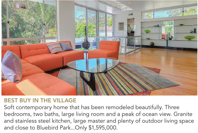 BEST BUY IN THE VILLAGE Soft contemporary home that has been remodeled beautifully. Three bedrooms, two baths, large living room and a peak of ocean view. Granite and stainless steel kitchen, large master and plenty of outdoor living space and close to Bluebird Park...Only $1,595,000.