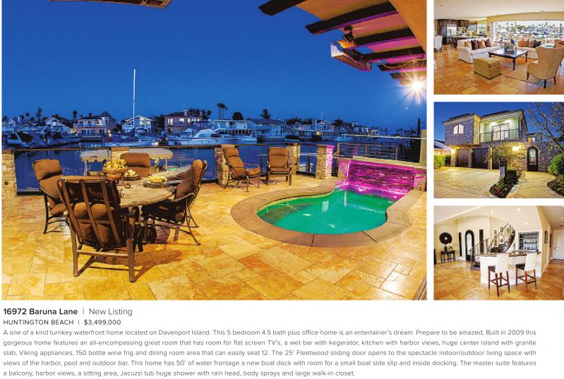 16972 Baruna Lane | New Listing HUNTINGTON BEACH | $3,499,000 A one of a kind turnkey waterfront home located on Davenport Island. This 5 bedroom 4.5 bath plus office home is an entertainer’s dream. Prepare to be amazed, Built in 2009 this gorgeous home features an all-encompassing great room that has room for flat screen TV’s, a wet bar with kegerator, kitchen with harbor views, huge center island with granite slab, Viking appliances, 150 bottle wine frig and dining room area that can easily seat 12. The 25’ Fleetwood sliding door opens to the spectacle indoor/outdoor living space with views of the harbor, pool and outdoor bar. This home has 50’ of water frontage a new boat dock with room for a small boat side slip and inside docking. The master suite features a balcony, harbor views, a sitting area, Jacuzzi tub huge shower with rain head, body sprays and large walk-in closet.
