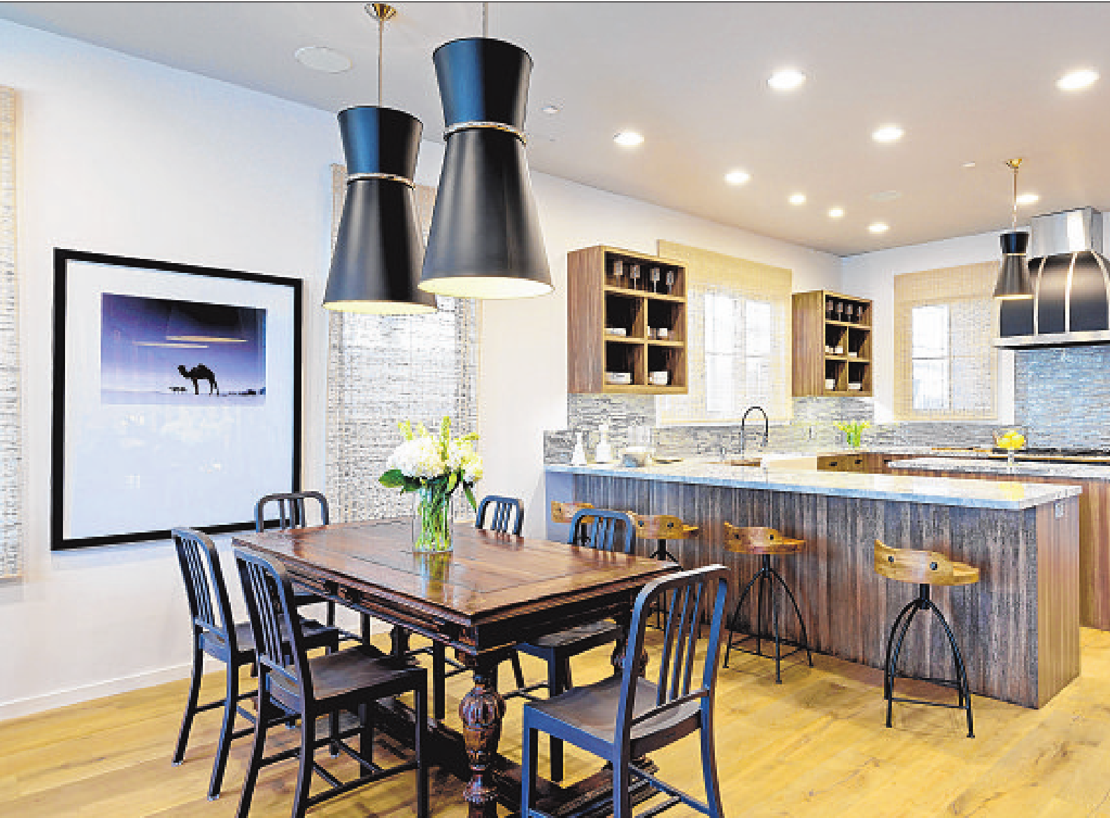 pendant lights top an open dining area, and achef’s kitchen has a La