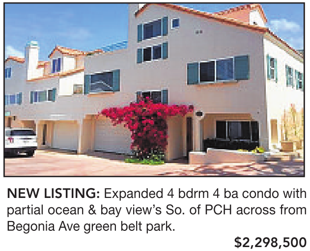 NEW LISTING: Expanded 4 bdrm 4 ba condo with partial ocean & bay view’s So. of PCH across from Begonia Ave green belt park.