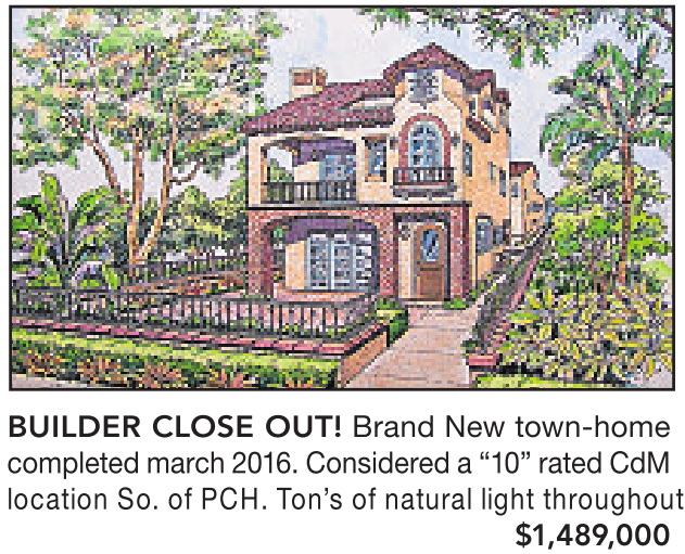 BUILDER CLOSE OUT! Brand New town-home completed march 2016. Considered a “10” rated CdM location So. of PCH. Ton’s of natural light throughout.