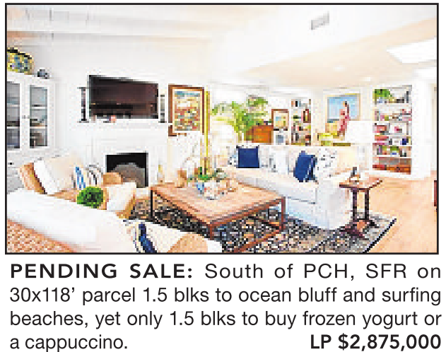 PENDING SALE: South of PCH, SFR on 30x118’ parcel 1.5 blks to ocean bluff and surfing beaches, yet only 1.5 blks to buy frozen yogurt or a cappuccino. LP $2,875,000