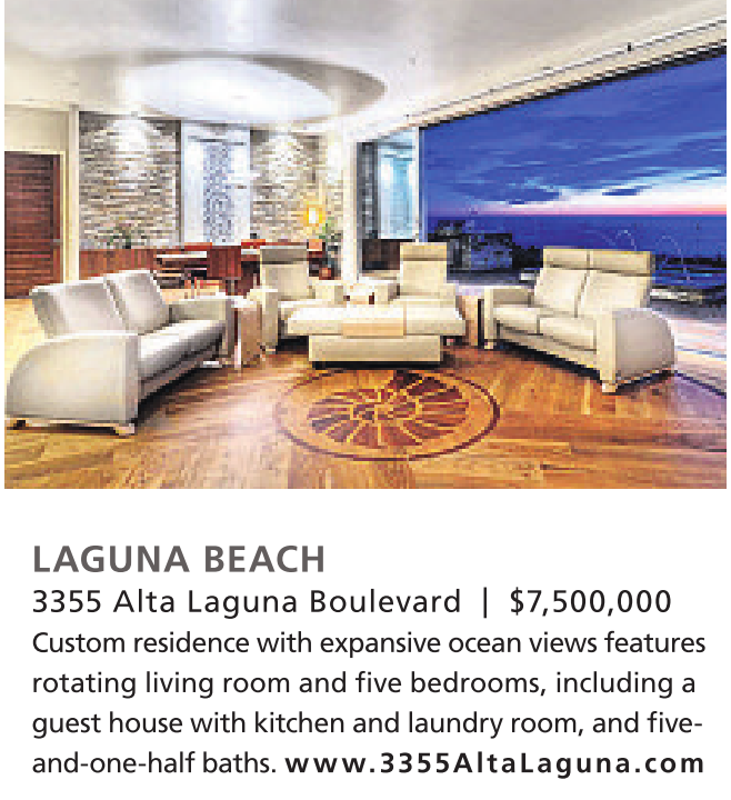 Custom residence with expansive ocean views features rotating living room and five bedrooms, including a guest house with kitchen and laundry room, and fiveand-one-half baths. www.3355AltaLaguna.com