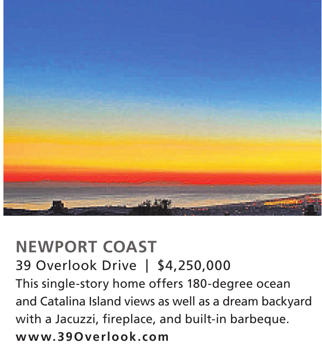 This single-story home offers 180-degree ocean and Catalina Island views as well as a dream backyard with a Jacuzzi, fireplace, and built-in barbeque. www.39Overlook.com