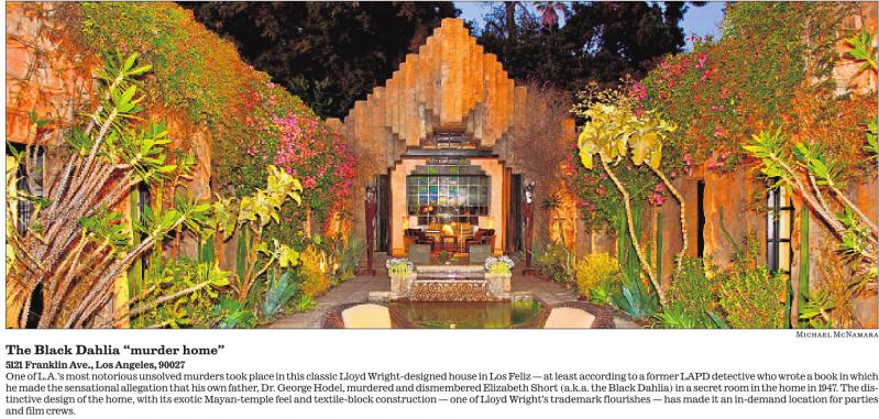 The Black Dahlia “murder home” 5121 Franklin Ave., Los Angeles, 90027 One of L.A.’s most notorious unsolved murders took place in this classic Lloyd Wright-designed house in Los Feliz — at least according to a former LAPD detective who wrote a book in which he made the sensational allegation that his own father, Dr. George Hodel, murdered and dismembered Elizabeth Short (a.k.a. the Black Dahlia) in a secret room in the home in1947. The distinctive design of the home, with its exotic Mayan-temple feel and textile-block construction — one of Lloyd Wright’s trademark flourishes — has made it an in-demand location for parties and film crews.