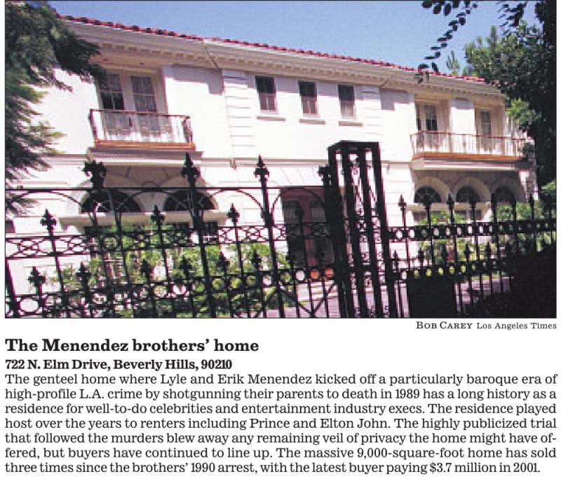 The Menendez brothers’ home 722 N. Elm Drive, Beverly Hills, 90210 The genteel home where Lyle and Erik Menendez kicked off a particularly baroque era of high-profile L.A. crime by shotgunning their parents to death in 1989 has a long history as a residence for well-to-do celebrities and entertainment industry execs. The residence played host over the years to renters including Prince and Elton John. The highly publicized trial that followed the murders blew away any remaining veil of privacy the home might have offered, but buyers have continued to line up. The massive 9,000-square-foot home has sold three times since the brothers’ 1990 arrest, with the latest buyer paying $3.7 million in 2001.