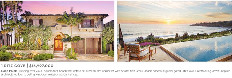 1 ritz cove | $16,997,000 Dana Point: Stunning over 7,500 square foot beachfront estate situated on rare corner lot with private Salt Creek Beach access in guard-gated Ritz Cove. Breathtaking views, inspired architecture, floor to ceiling windows, elevator, six-car garage.
