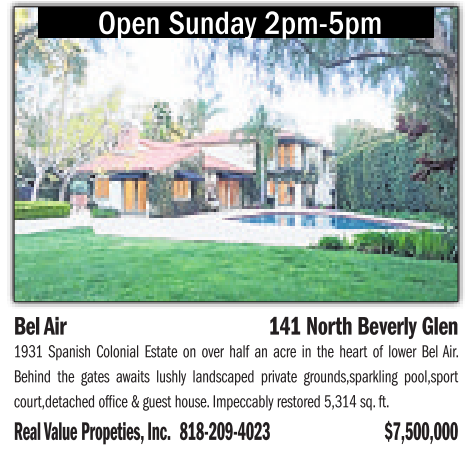 Open Sunday 2pm-5pm Bel Air 141 NorthBeverly Glen 1931 Spanish Colonial Estate on over half an acre in the heart of lower Bel Air. Behind the gates awaits lushly landscaped private grounds,sparkling pool,sport court,detached office &guest house. Impeccably restored5,314 sq.ft. RealValue Propeties, Inc. 818-209-4023 $7,500,000