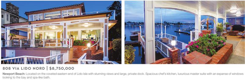Newport Beach: Located on the coveted eastern end of Lido Isle with stunning views and large, private dock. Spacious chef’s kitchen, luxurious master suite with an expanse of windows looking to the bay and spa-like bath.