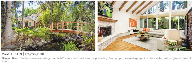 Newport Beach: Five bedroom estate on huge, over 14,000 square foot lot with a lush, tropical setting. Soaring, open beam ceilings, spacious chef’s kitchen, walls of glass, truly one of a kind.