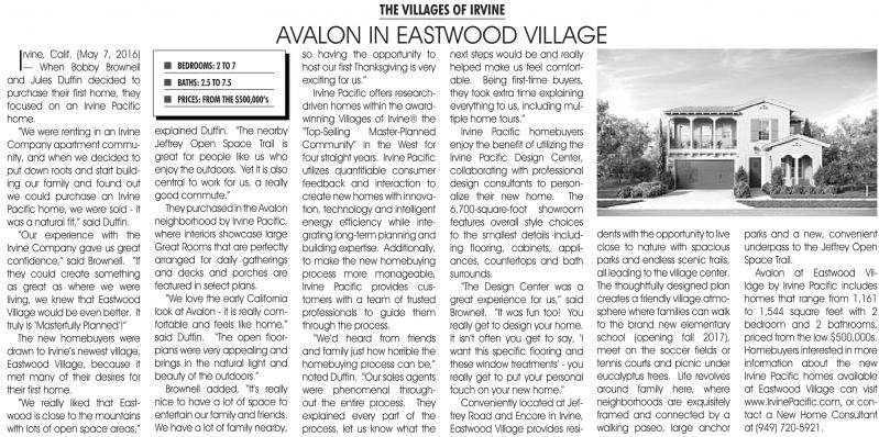 “our experience with the Irvine Company gave us great confidence,” said Brownell. “If they could create something as great as where we were living, we knew that Eastwood Village would be even better. It truly is ‘Masterfully Planned’!” The new homebuyers were drawn to Irvine’s newest village, Eastwood Village, because it met many of their desires for their first home.