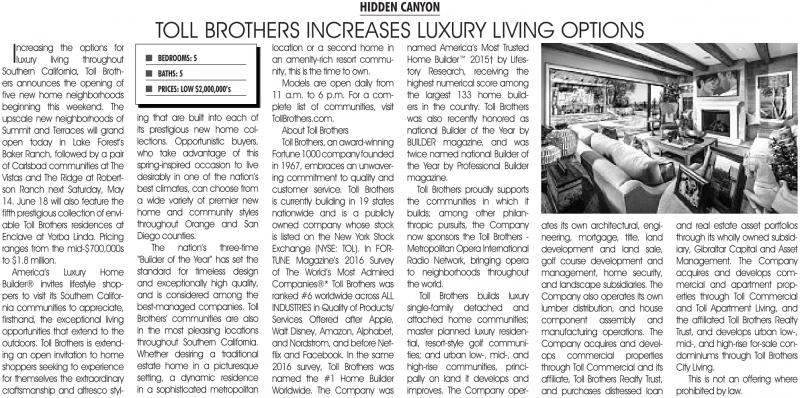 the options for luxury living throughout Southern California, Toll Brothers announces the opening of five new home neighborhoods beginning this weekend. The upscale new neighborhoods of Summit and Terraces will grand open today in Lake Forest’s Baker Ranch, followed by a pair of Carlsbad communities at The Vistas and The Ridge at Robertson Ranch next Saturday, May 14. June 18 will also feature the fifth prestigiouscollection of enviable Toll Brothers residences at Enclave at Yorba Linda. Pricing ranges from the mid-$700,000s to $1.8 million.