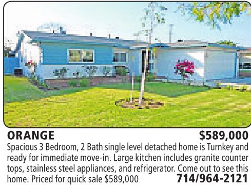 ORANGE $589,000 Spacious 3Bedroom, 2Bathsingle leveldetachedhome is Turnkeyand readyfor immediatemove-in. Largekitchen includes granite counter tops,stainlesssteel appliances,and refrigerator.Come outtosee this home.Pricedfor quicksale$589,000 714/964-2121