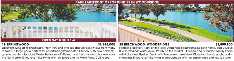 RARE LAKEFRONT OPPORTUNITIES IN WOODBRIDGE OPEN SAT & SUN 1-4 19 SPRINGWOOD $1,295,000 Lakefront living at its finest! Rare, Front Row unit with spectacular Lake Views from many rooms & a large patio perfect for entertaining!Remodeled kitchen with new cabinets, granite counters.Spacious Master Bedroom with Retreat and fantastic deck that overlooks the North Lake. Enjoy resort like living with low taxes and no Mello Roos. Call to see! 25 BEECHWOOD, WOODBRIDGE $1,899,900 Fantastic location, Right onthe lake! Detached 4bedrooms 2.5 bath home, app 2400 sq ft with fabulous water view!! Rarely on the market ! Kitchen and Extended Family Room with Lake view. Upstair Deck with Panoramic Lake View. Close to schools, pools, parks, shopping..Enjoy resort like living in Woodbridge with low assoc dues and low tax rate!