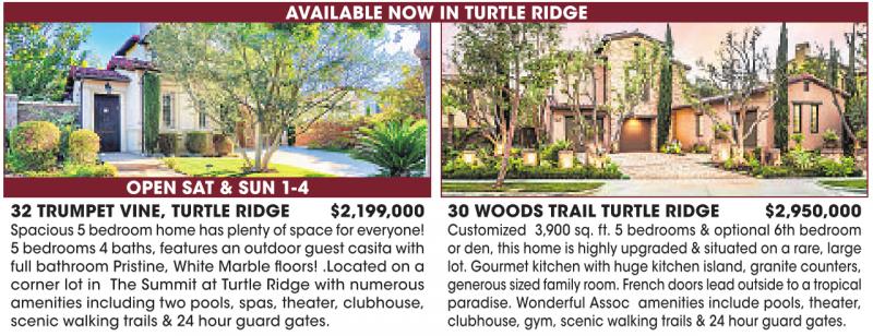 AVAILABLE NOW IN TURTLE RIDGE OPEN SAT & SUN 1-4 32 TRUMPET VINE, TURTLE RIDGE $2,199,000 Spacious 5bedroom home hasplentyofspace foreveryone! 5bedrooms 4baths, features anoutdoor guest casita with full bathroom Pristine, White Marble floors! .Located on a corner lot in The Summit at Turtle Ridge with numerous amenities including two pools, spas, theater, clubhouse, scenic walking trails & 24 hour guard gates. 30 WOODS TRAIL TURTLE RIDGE $2,950,000 Customized 3,900 sq. ft. 5 bedrooms & optional 6th bedroom or den, this home is highly upgraded &situated on arare, large lot. Gourmet kitchen with huge kitchen island, granite counters, generous sized family room. French doors lead outside toatropical paradise. Wonderful Assoc amenities include pools, theater, clubhouse, gym, scenic walking trails & 24 hour guard gates.