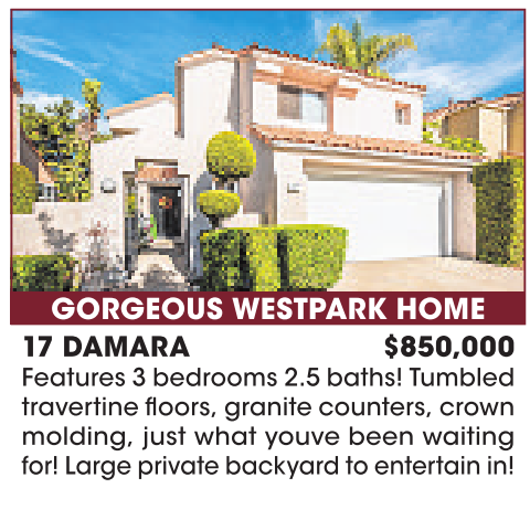 GORGEOUS WESTPARK HOME 17 DAMARA $850,000 Features 3 bedrooms 2.5 baths! Tumbled travertine floors, granite counters, crown molding, just what youve been waiting for! Large private backyard to entertain in!