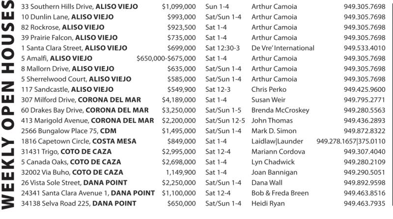 33 SouthernHills Drive, ALISO VIEJO $1,099,000 Sun 1-4 Arthur Camoia 949.305.7698 10 Dunlin Lane, ALISO VIEJO $993,000 Sat/Sun 1-4 Arthur Camoia 949.305.7698 82 Rockrose, ALISO VIEJO $923,500 Sat1-4 Arthur Camoia 949.305.7698 39 Prairie Falcon, ALISO VIEJO $735,000 Sat1-4 Arthur Camoia 949.305.7698 1Santa ClaraStreet, ALISO VIEJO $699,000 Sat12:30-3 De Vre’ International 949.533.4010 5Amalfi, ALISO VIEJO $650,000-$675,000 Sat1-4 Arthur Camoia 949.305.7698 8MallornDrive, ALISO VIEJO $635,000 Sat/Sun 1-4 Arthur Camoia 949.305.7698 5Sherrelwood Court, ALISO VIEJO $585,000 Sat/Sun 1-4 Arthur Camoia 949.305.7698 117 Sandcastle, ALISO VIEJO $549,900 Sat12-3 Chris Perko 949.425.9600 307 MilfordDrive, CORONA DEL MAR $4,189,000 Sat1-4 Susan Weir 949.795.2771 60 Drakes BayDrive, CORONA DEL MAR $3,250,000 Sat/Sun 1-5 Brenda McCroskey 949.280.5563 413 Marigold Avenue, CORONA DEL MAR $2,200,000 Sat/Sun 12-5 John Thomas 949.436.2893 2566 BungalowPlace75, CDM $1,495,000 Sat/Sun 1-4 Mark D. Simon 949.872.8322 1816 CapetownCircle, COSTAMESA $849,000 Sat1-4 Laidlaw|Launder 949.278.1657|375.0110 31431 Trigo, COTODECAZA $2,995,000 Sat12-4 Mariann Cordova 949.307.4040 5Canada Oaks, COTODECAZA $2,698,000 Sat1-4 LynChadwick 949.280.2109 32002 ViaBuho, COTO DE CAZA 1,149,900 Sat1-4 Joan Bannigan 949.290.5051 26 Vista Sole Street, DANA POINT $2,250,000 Sat/Sun 1-4 Dana Wall 949.892.9598 24341 SantaClaraAvenue 1, DANA POINT $1,100,000 Sat12-4 Bob&Freda Breen 949.463.8516 34138 SelvaRoad 225, DANA POINT $650,000 Sat/Sun 1-4 Heidi Ryan 949.463.7935