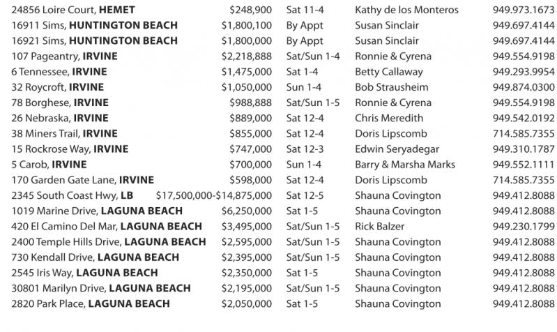 24856 LoireCourt, HEMET $248,900 Sat11-4 Kathydelos Monteros 949.973.1673 16911 Sims, HUNTINGTON BEACH $1,800,100 By Appt Susan Sinclair 949.697.4144 16921 Sims, HUNTINGTON BEACH $1,800,000 By Appt Susan Sinclair 949.697.4144 107 Pageantry, IRVINE $2,218,888 Sat/Sun1-4 Ronnie &Cyrena 949.554.9198 6Tennessee, IRVINE $1,475,000 Sat1-4 BettyCallaway 949.293.9954 32 Roycroft, IRVINE $1,050,000 Sun 1-4 BobStrausheim 949.874.0300 78 Borghese, IRVINE $988,888 Sat/Sun 1-5 Ronnie&Cyrena 949.554.9198 26 Nebraska, IRVINE $889,000 Sat12-4 Chris Meredith 949.542.0192 38 Miners Trail, IRVINE $855,000 Sat 12-4 DorisLipscomb 714.585.7355 15 Rockrose Way, IRVINE $747,000 Sat 12-3 Edwin Seryadegar 949.310.1787 5Carob, IRVINE $700,000 Sun 1-4 Barry &Marsha Marks 949.552.1111 170 Garden Gate Lane, IRVINE $598,000 Sat 12-4 DorisLipscomb 714.585.7355 2345 South Coast Hwy, LB $17,500,000-$14,875,000 Sat12-5 Shauna Covington 949.412.8088 1019 Marine Drive, LAGUNA BEACH $6,250,000 Sat1-5 Shauna Covington 949.412.8088 420 El Camino DelMar, LAGUNA BEACH $3,495,000 Sat/Sun 1-5 RickBalzer 949.230.1799 2400 Temple Hills Drive, LAGUNA BEACH $2,595,000 Sat/Sun 1-5 Shauna Covington 949.412.8088 730 Kendall Drive, LAGUNA BEACH $2,395,000 Sat/Sun 1-5 Shauna Covington 949.412.8088 2545 Iris Way, LAGUNA BEACH $2,350,000 Sat1-5 Shauna Covington 949.412.8088 30801 Marilyn Drive, LAGUNA BEACH $2,195,000 Sat/Sun 1-5 Shauna Covington 949.412.8088 2820 Park Place, LAGUNA BEACH $2,050,000 Sat 1-5 Shauna Covington 949.412.8088