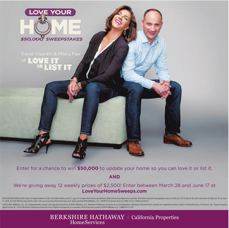 Enter for a chance to win $50,000 to update your home so you can love it or list it. AND We’re giving away 12 weekly prizes of $2,500! Enter between March 28 and June 17 at LoveYourHomeSweeps.com NO PURCHASE NECESSARY. Opentolegal residents of the 50 United States and D.C., age 21 or older.Void whereprohibited.Odds of winning depend on number of entries received.Sweepstakes starts at 9:00 a.m. ET on March28, 2016 and ends at 5:00 p.m. ET on June 17, 2016. Forfull official rules and to enter, visit www.LoveYourHomeSweeps.com. Sponsored by BHH Affiliates, LLC, 18500 VonKarman Avenue,#400, Irvine, California 92612. ©2016 BHH Affiliates, LLC. An independently owned and operated franchise of BHH Affiliates, LLC. Berkshire Hathaway HomeServices and Berkshire Hathaway HomeServices symbol are registered service marks of HomeServices of America, Inc.® Equal Housing Opportunity. ©2016 BerkshireHathawayHomeServices California Properties is amember of the franchise system of BHH AffiliatesLLC.CalBRE01317331
