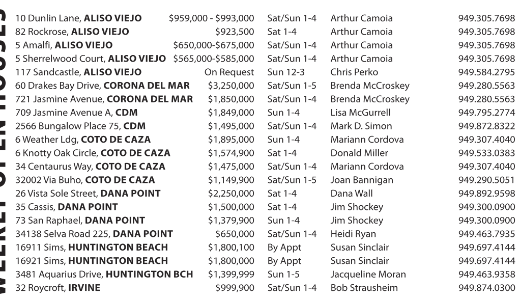 10 Dunlin Lane, ALISO VIEJO $959,000 -$993,000 Sat/Sun 1-4 Arthur Camoia 949.305.7698 82 Rockrose, ALISO VIEJO $923,500 Sat1-4 Arthur Camoia 949.305.7698 5Amalfi, ALISO VIEJO $650,000-$675,000 Sat/Sun 1-4 Arthur Camoia 949.305.7698 5Sherrelwood Court, ALISO VIEJO $565,000-$585,000 Sat/Sun 1-4 Arthur Camoia 949.305.7698 117 Sandcastle, ALISO VIEJO On Request Sun 12-3 Chris Perko 949.584.2795 60 Drakes BayDrive, CORONA DEL MAR $3,250,000 Sat/Sun 1-5 Brenda McCroskey 949.280.5563 721 Jasmine Avenue, CORONA DEL MAR $1,850,000 Sat/Sun 1-4 Brenda McCroskey 949.280.5563 709 Jasmine Avenue A, CDM $1,849,000 Sun 1-4 Lisa McGurrell 949.795.2774 2566 BungalowPlace75, CDM $1,495,000 Sat/Sun 1-4 Mark D. Simon 949.872.8322 6Weather Ldg, COTO DE CAZA $1,895,000 Sun 1-4 Mariann Cordova 949.307.4040 6KnottyOak Circle, COTO DE CAZA $1,574,900 Sat 1-4 Donald Miller 949.533.0383 34 Centaurus Way, COTO DE CAZA $1,475,000 Sat/Sun 1-4 Mariann Cordova 949.307.4040 32002 ViaBuho, COTO DE CAZA $1,149,900 Sat/Sun 1-5 Joan Bannigan 949.290.5051 26 Vista Sole Street, DANA POINT $2,250,000 Sat 1-4 Dana Wall 949.892.9598 35 Cassis, DANA POINT $1,500,000 Sat 1-4 Jim Shockey 949.300.0900 73 San Raphael, DANA POINT $1,379,900 Sun 1-4 Jim Shockey 949.300.0900 34138 Selva Road 225, DANA POINT $650,000 Sat/Sun 1-4 Heidi Ryan 949.463.7935 16911 Sims, HUNTINGTON BEACH $1,800,100 By Appt Susan Sinclair 949.697.4144 16921 Sims, HUNTINGTON BEACH $1,800,000 By Appt Susan Sinclair 949.697.4144 3481AquariusDrive, HUNTINGTON BCH $1,399,999 Sun 1-5 Jacqueline Moran 949.463.9358 32 Roycroft, IRVINE $999,900 Sat/Sun 1-4 Bob Strausheim 949.874.0300