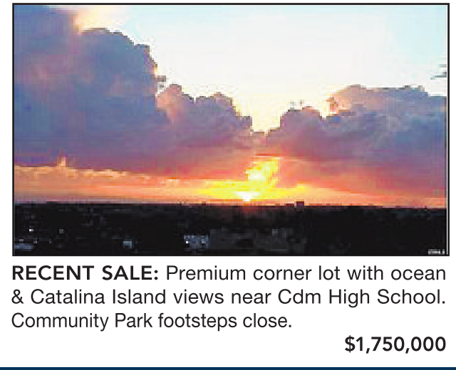 RECENT SALE: Premium corner lot with ocean & Catalina Island views near Cdm High School. Community Park footsteps close.