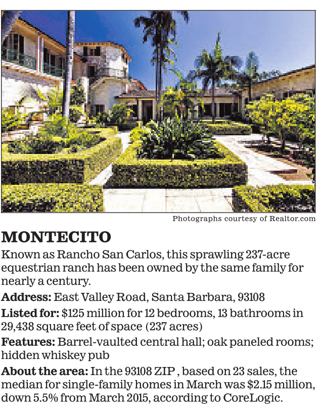 MONTECITO Known as Rancho San Carlos, this sprawling 237-acre equestrian ranch has been owned by the same family for nearly a century. Address: East Valley Road, Santa Barbara, 93108 Listed for: $125 million for 12 bedrooms, 13 bathrooms in 29,438 square feet of space (237 acres)