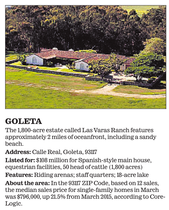 GOLETA The 1,800-acre estate called Las Varas Ranch features approximately 2 miles of oceanfront, including a sandy beach. Address: Calle Real, Goleta, 93117 Listed for: $108 million for Spanish-style main house, equestrian facilities, 50 head of cattle (1,800 acres)
