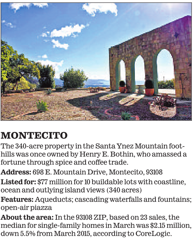 MONTECITO The 340-acre property in the Santa Ynez Mountain foothills was once owned by Henry E. Bothin, who amassed a fortune through spice and coffee trade. Address: 698 E. Mountain Drive, Montecito, 93108 Listed for: $77 million for 10 buildable lots with coastline, ocean and outlying island views (340 acres)