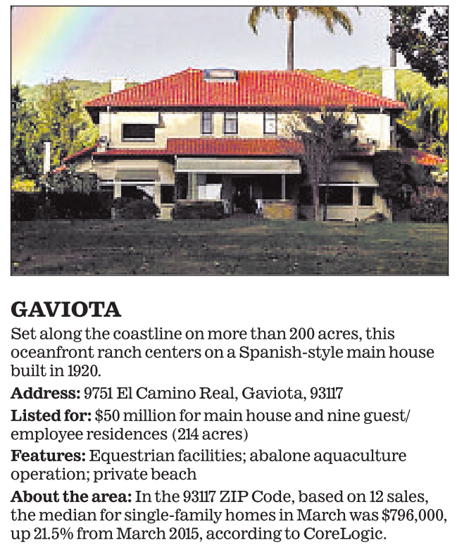 GAVIOTA Set along the coastline on more than 200 acres, this oceanfront ranch centers on a Spanish-style main house built in 1920. Address: 9751 El Camino Real, Gaviota, 93117 Listed for: $50 million for main house and nine guest/ employee residences (214 acres)