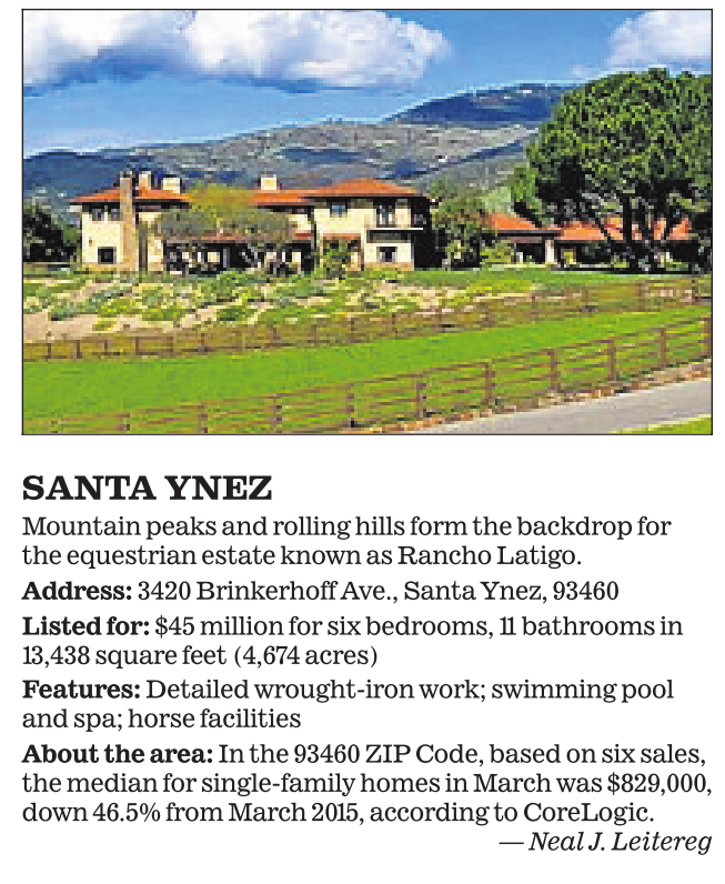About the area: In the 93460 ZIP Code, based on six sales, the median for single-family homes in March was $829,000, down 46.5% from March 2015, according to CoreLogic.