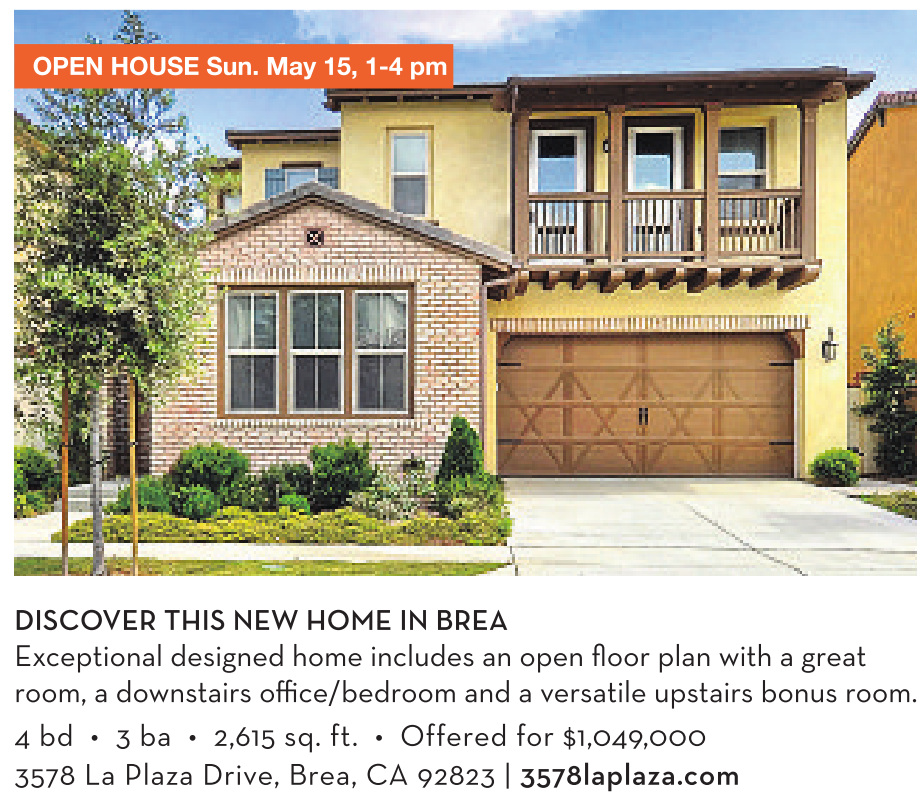 OPEN HOUSE Sun. May 15, 1-4 pm DISCOVER THIS NEW HOME IN BREA Exceptional designed home includes an open floor plan with a great room, a downstairs office/bedroom and a versatile upstairs bonus room. 4 bd • 3 ba • 2,615 sq. ft. • Offered for $1,049,000 3578 La Plaza Drive, Brea, CA 92823 | 3578laplaza.com