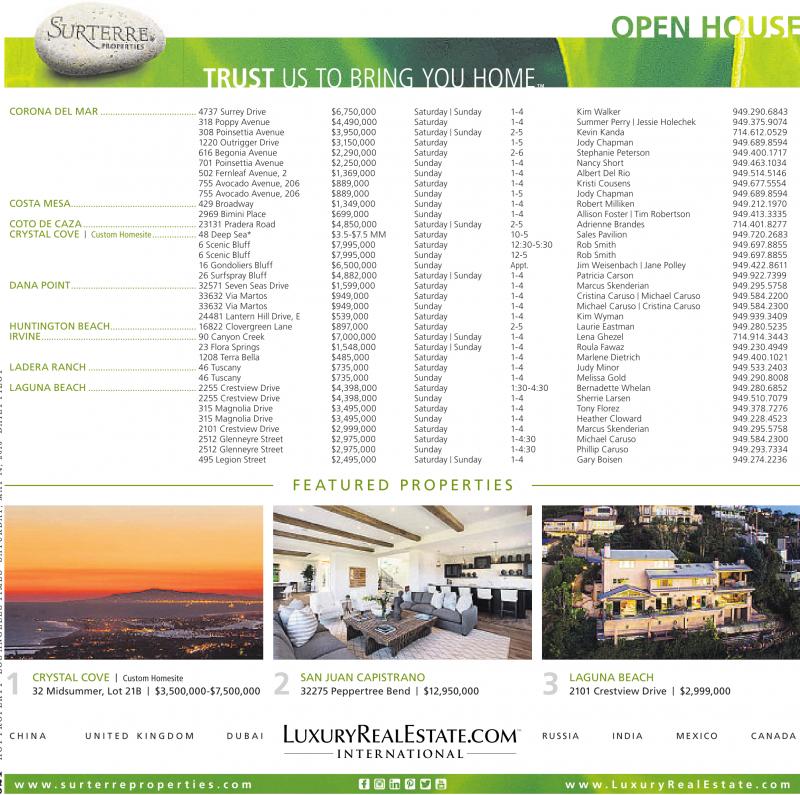 CORONA DEL MAR ....................................... 4737 Surrey Drive $6,750,000 Saturday | Sunday 1-4 Kim Walker 949.290.6843 318 Poppy Avenue $4,490,000 Saturday 1-4 Summer Perry | Jessie Holechek 949.375.9074 308 Poinsettia Avenue $3,950,000 Saturday | Sunday 2-5 Kevin Kanda 714.612.0529 1220 Outrigger Drive $3,150,000 Saturday 1-5 Jody Chapman 949.689.8594 616 Begonia Avenue $2,290,000 Saturday 2-6 Stephanie Peterson 949.400.1717 701 Poinsettia Avenue $2,250,000 Sunday 1-4 Nancy Short 949.463.1034 502 Fernleaf Avenue, 2 $1,369,000 Sunday 1-4 Albert Del Rio 949.514.5146 755 Avocado Avenue, 206 $889,000 Saturday 1-4 Kristi Cousens 949.677.5554 755 Avocado Avenue, 206 $889,000 Sunday 1-5 Jody Chapman 949.689.8594 COSTA MESA................................................... 429 Broadway $1,349,000 Sunday 1-4 Robert Milliken 949.212.1970 2969 Bimini Place $699,000 Sunday 1-4 Allison Foster | Tim Robertson 949.413.3335 COTO DE CAZA.............................................. 23131 Pradera Road $4,850,000 Saturday | Sunday 2-5 Adrienne Brandes 714.401.8277 CRYSTAL COVE | CustomHomesite.................. 48 Deep Sea* $3.5-$7.5 MM Saturday 10-5 Sales Pavilion 949.720.2683 6 Scenic Bluff $7,995,000 Saturday 12:30-5:30 Rob Smith 949.697.8855 6 Scenic Bluff $7,995,000 Sunday 12-5 Rob Smith 949.697.8855 16 Gondoliers Bluff $6,500,000 Sunday Appt. Jim Weisenbach | Jane Polley 949.422.8611 26 Surfspray Bluff $4,882,000 Saturday | Sunday 1-4 Patricia Carson 949.922.7399 DANA POINT................................................... 32571 Seven Seas Drive $1,599,000 Saturday 1-4 Marcus Skenderian 949.295.5758 33632 Via Martos $949,000 Saturday 1-4 Cristina Caruso | Michael Caruso 949.584.2200 33632 Via Martos $949,000 Sunday 1-4 Michael Caruso | Cristina Caruso 949.584.2300 24481 Lantern Hill Drive, E $539,000 Saturday 1-4 Kim Wyman 949.939.3409 HUNTINGTON BEACH................................... 16822 Clovergreen Lane $897,000 Saturday 2-5 Laurie Eastman 949.280.5235 IRVINE............................................................... 90 Canyon Creek $7,000,000 Saturday | Sunday 1-4 Lena Ghezel 714.914.3443 23 Flora Springs $1,548,000 Saturday | Sunday 1-4 Roula Fawaz 949.230.4949 1208 Terra Bella $485,000 Saturday 1-4 Marlene Dietrich 949.400.1021 LADERA RANCH ............................................ 46 Tuscany $735,000 Saturday 1-4 Judy Minor 949.533.2403 46 Tuscany $735,000 Sunday 1-4 Melissa Gold 949.290.8008 LAGUNA BEACH ............................................ 2255 Crestview Drive $4,398,000 Saturday 1:30-4:30 Bernadette Whelan 949.280.6852 2255 Crestview Drive $4,398,000 Sunday 1-4 Sherrie Larsen 949.510.7079 315 Magnolia Drive $3,495,000 Saturday 1-4 Tony Florez 949.378.7276 315 Magnolia Drive $3,495,000 Sunday 1-4 Heather Cloward 949.228.4523 2101 Crestview Drive $2,999,000 Saturday 1-4 Marcus Skenderian 949.295.5758 2512 Glenneyre Street $2,975,000 Saturday 1-4:30 Michael Caruso 949.584.2300 2512 Glenneyre Street $2,975,000 Sunday 1-4:30 Phillip Caruso 949.293.7334 495 Legion Street $2,495,000 Saturday | Sunday 1-4 Gary Boisen 949.274.2236