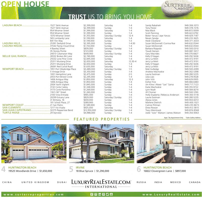 LAGUNA BEACH........................................1527 Tahiti Avenue $2,399,000 Saturday 1-4 Sandy Rabahieh 949.306.1073 1527 Tahiti Avenue $2,399,000 Sunday 1-4 Tony Florez 949.378.7276 954 Miramar Street $1,399,000 Saturday 1-4 Max Black 949.872.0009 954 Miramar Street $1,399,000 Sunday 1-4 Scott Panning 949.422.6792 1070 Miramar Street $1,355,000 Saturday | Sunday 12-4 Boker Yaruss | Jaye Yaruss 949.929.7187 565 Lombardy Lane $1,199,000 Saturday 1-4 Neven Spralja 949.233.3625 841 Fen Way $1,199,000 Sunday 1-3 Heidi Cleveland 949.371.4333 LAGUNA HILLS..........................................25391 Derbyhill Drive $2,395,000 Sunday 1-4:30 Susan McDonnell | Corrina Roe 949.632.0544 LAGUNA NIGUEL.......................................31542 Flying Cloud Drive $1,150,000 Sunday 1-4 Susan McDonnell 949.632.0544 4 Bawley Street $839,000 Saturday | Sunday 1-4 Barbara Roppolo 949.500.0310 35 Stoney Pointe $723,000 Sunday 1-4 Traudi Hansen 949.887.3417 24013 Catamaran Way $649,900 Saturday | Sunday 1-4 Gary Macrides 949.370.6827 NELLIE GAIL RANCH..................................26532 Broken Bit Lane $2,749,000 Saturday 1-4 Kelly O’Hagan 949.292.5636 25532 Lone Pine Circle $2,695,000 Sunday 1-4 Jerry La Mott 949.472.9191 25311 Mustang Drive $2,650,000 Saturday 12:30-4 Jerry La Mott 949.472.9191 25311 Mustang Drive $2,650,000 Sunday 1-4 Kelly O’Hagan 949.292.5636 26091 Red Corral Road $1,635,000 Saturday 1-4 Jerry La Mott 949.472.9191 NEWPORT BEACH .....................................1951 Port Weybridge Place $3,489,000 Saturday | Sunday 1-5 Mali Gulledge 949.500.4399 5 Vintage Drive $3,350,000 Sunday 1-4 Andrew Machoskie 949.302.5398 1001 Hampshire Lane $2,475,000 Sunday 2-5 Laurie Eastman 949.280.5235 2053 Port Bristol Circle $2,295,000 Sunday 1-4 Julia Liao 949.278.9528 1406 Antigua Way $1,850,000 Saturday 12-3 John Vitti 949.629.0935 1406 Antigua Way $1,850,000 Sunday 1-4 Esther Fine 949.466.6483 2004 Yacht Vigilant $1,845,000 Sunday 1-4 Jim Kline | Alexei “Lex” Sarna 949.717.7123 3132 Corte Caleta $1,348,000 Sunday 1-4 Katie Machoskie 949.355.9722 3173 Corte Portofino $1,269,000 Sunday 1-4 Lynn Noah 949.584.8214 118.5 36 th Street $1,260,000 Sunday 1-4 Jill Chomer 949.500.1290 2100 Vista Entrada $965,000 Sunday 1-4 Holly Duplanty | Rebecca Anderson 949.300.5118 20299 Estuary Lane $829,000 Saturday | Sunday 2-5 Laurie Eastman 949.280.5235 31 Brittany, 16 $659,000 Sunday 1-4 Alyssa Jones 949.903.6013 101 Scholz Plaza, 27 $389,900 Sunday 1-4 Marlene Dietrich 949.400.1021 NEWPORT COAST .....................................21 San Pietro $1,589,900 Sunday 1-4 Catrice Pittman 949.235.9673 SAN CLEMENTE.........................................1217 Via Visalia $925,000 Saturday 1-4 Drew Rowan 949.412.5815 SAN JUAN CAPISTRANO...........................32275 Peppertree Bend $12,950,000 Saturday | Sunday 1-4 Tracy Weintraub 949.874.8568 TURTLE RIDGE ...........................................29 Starview $4,988,000 Sunday 1-4 Joele “JoJo” Watson | James Watson 949.350.9363
