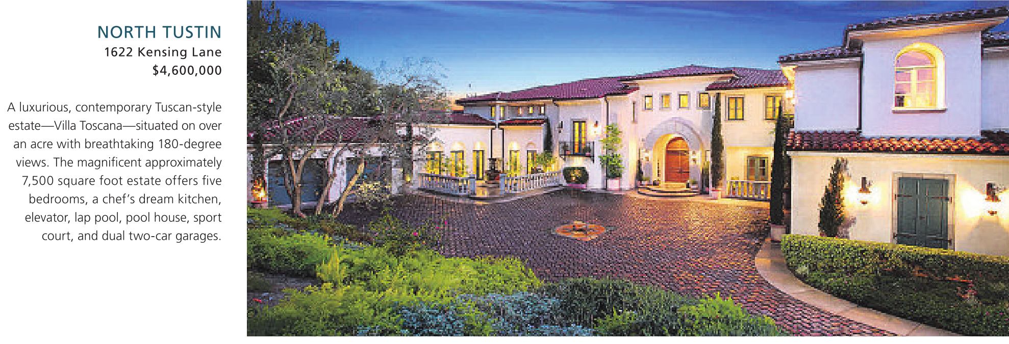 NORTH TUSTIN 1622 Kensing Lane $4,600,000 A luxurious, contemporary Tuscan-style estate—Villa Toscana—situated on over an acre with breathtaking 180-degree views. The magnificent approximately 7,500 square foot estate offers five bedrooms, a chef’s dream kitchen, elevator, lap pool, pool house, sport court, and dual two-car garages. See also