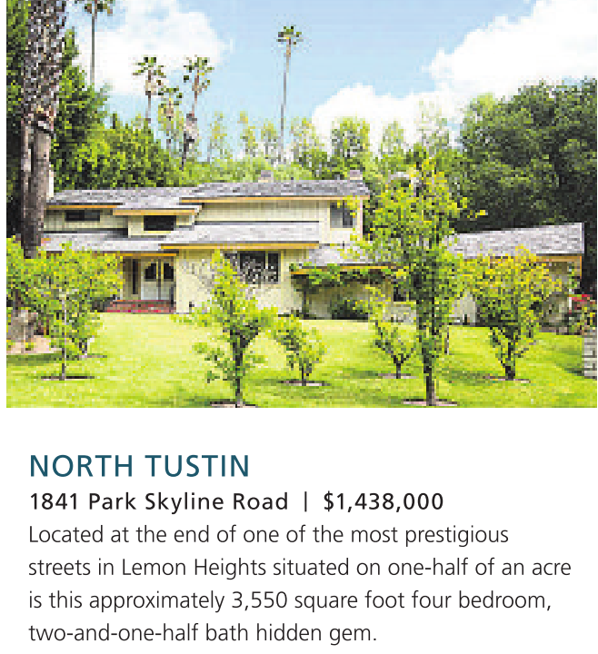 NORTH TUSTIN 1841 Park Skyline Road | $1,438,000 Located at the end of one of the most prestigious streets in Lemon Heights situated on one-half of an acre is this approximately 3,550 square foot four bedroom, two-and-one-half bath hidden gem. See also
