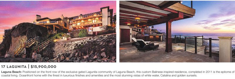 17 LAGUNITA | $15,900,000 Laguna Beach: Positioned on the front row of the exclusive gated Lagunita community of Laguna Beach, this custom Balinese-inspired residence, completed in 2011 is the epitome of coastal living. Oceanfront home with the finest in luxurious finishes and amenities and the most stunning vistas of white water, Catalina and golden sunsets.