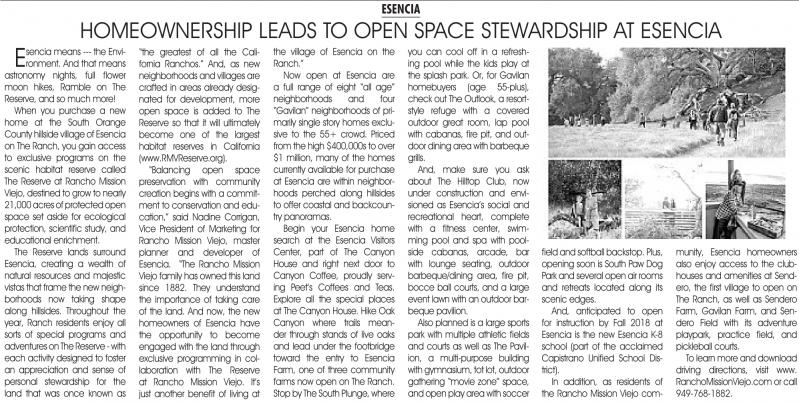 “Balancing open space preservation with community creation begins with a commitment to conservation and education,” said Nadine Corrigan, Vice President of Marketing for rancho Mission Viejo, master planner and developer of Esencia. “The rancho Mission Viejo family has owned this land since 1882. They understand the importance of taking care of the land. and now, the new homeowners of Esencia have the opportunity to become engaged with the land through exclusive programming in collaboration with The reserve at rancho Mission Viejo. It’s just another benefit of living at
