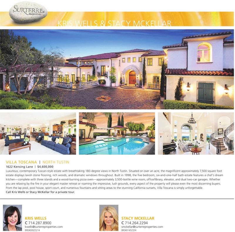 1622 Kensing Lane | $4,600,000 Luxurious, contemporary Tuscan-style estate with breathtaking 180-degree views in North Tustin. Situated on over an acre, the magnificent approximately 7,500 square foot estate displays lavish stone flooring, rich woods, and dramatic windows throughout. Built in 1998, the five bedroom, six-and-one-half bath estate features a chef’s dream kitchen—complete with three islands and a wood-burning pizza oven—approximately 3,500-bottle wine room, office/library, elevator, and dual two-car garages. Whether you are relaxing by the fire in your elegant master retreat or roaming the impressive, lush grounds, every aspect of the property will please even the most discerning buyers. From the lap pool, pool house, sport court, and numerous fountains and sitting areas to the stunning California sunsets, Villa Toscana is simply unforgettable. Call Kris Wells or Stacy McKellar for a private tour.